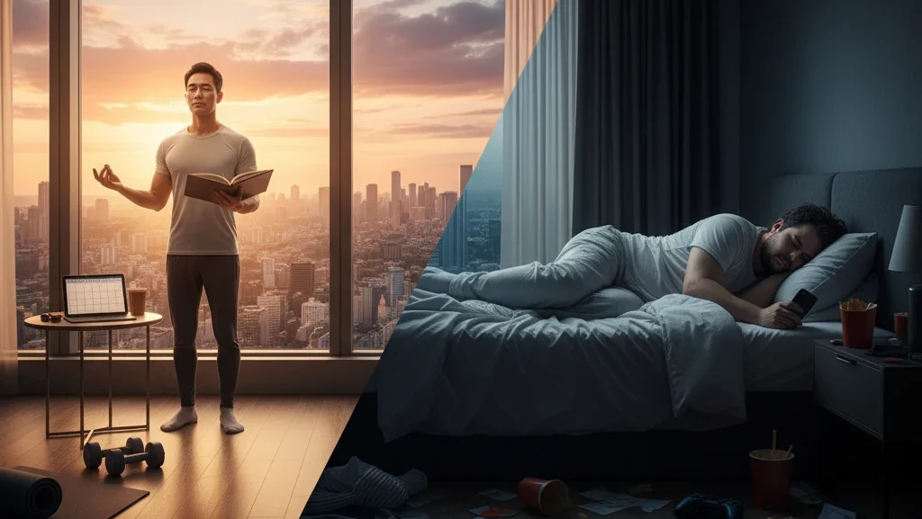 - Intenção vs. Reação: Ricos planejam o dia (na noite anterior ou às 5h da manhã). A maioria acorda e reage ao celular, começando o dia já perdendo de 1×0 para a distração.